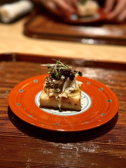 箸休めには、パンの上にキャビアと毛蟹を重ねた創作料理。サクッと香ばしいパンに蟹の旨味とキャビアの塩味が重なり、印象に残る味わいです。