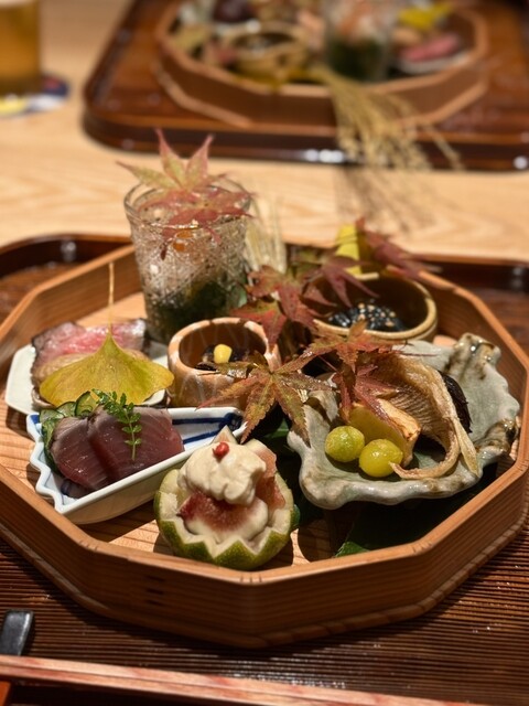 続く八寸は、秋の味覚が詰まった宝石箱。鰹のたたき、新取菜のお浸し、蛸の柔らか煮、鮎煎餅、栗、銀杏、落花生、百合根、無花果の白和え…。特に蛸は驚くほど柔らかく、銀杏の香ばしさが余韻を添えます