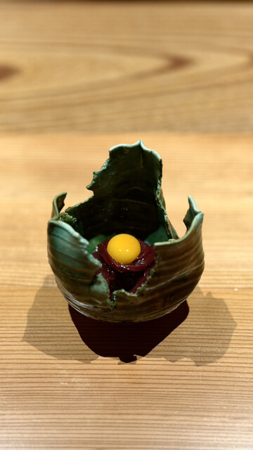 ぷりっとした独特の食感に、うずらの卵黄と胡麻油が絡み、臭みのない鹿肉の旨さがストレートに伝わります。
