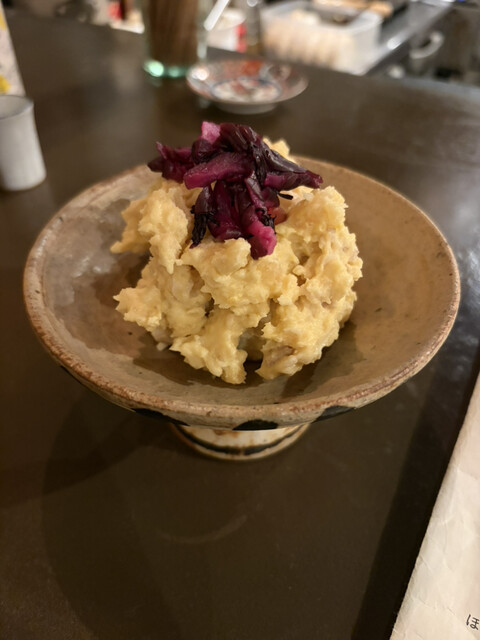 あったかめのポテサラ!上のトッピングをしば漬けとちりめんから選べるとのことで、しば漬けをチョイス、辛い系じゃ無いけどお酒にもあって美味しかった!