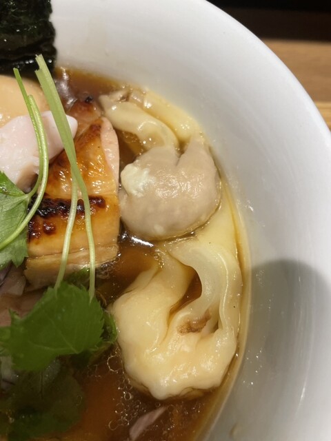 トッピングは、煮豚肩ロース・炭火炙りバラ・焼豚モモ昆布メ低温鶏ムネ(黒トリュフ)・炭火焼き鶏モモ・三つ葉・紫玉ねぎ(少量)・ワンタン2種(海老・肉)といった感じでしょうか。