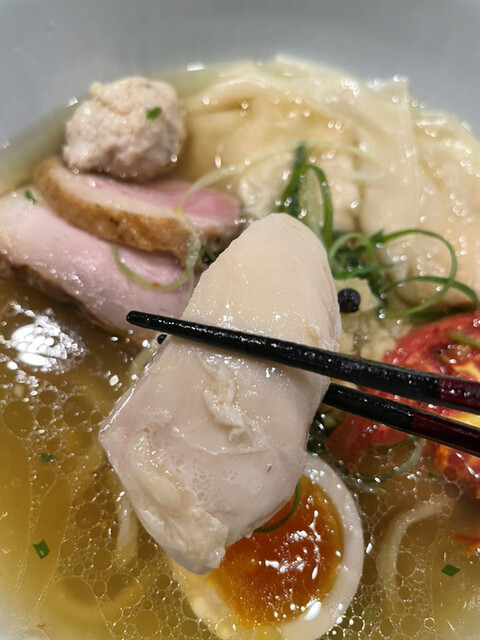 【特製塩そば1600円】トッピングは、雲呑×2・チャーシュー(鶏胸・鴨・モモ・肩ロース・肉団子)・味玉・ドライトマト・メンマ×2・ネギ・茗荷・胡椒の実といった感じでしょうか。