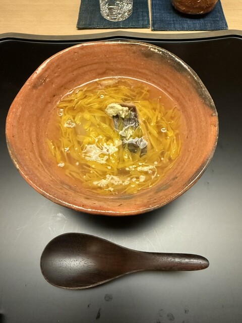 満月に見立てた黄色い胡麻豆腐のお椀は旨味たっぷりのすっぽん出汁。