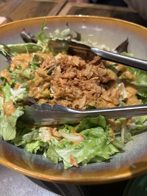 サラダは少しスパイシーなタレにフライオニオンがよくマッチしてこれだけでビール数杯いけました。