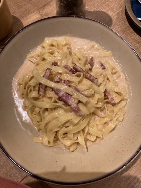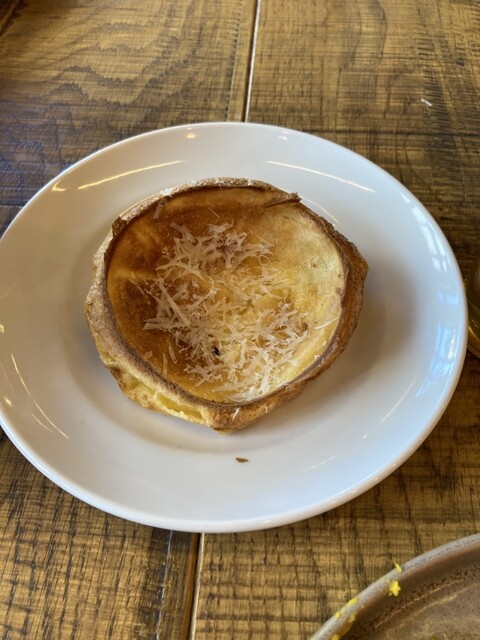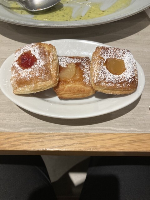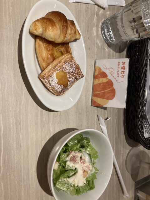 ランチセットのジェノベーゼクリームソースペコリーノ添えとドリンクとサラダ付き。スイーツパン食べ放題セットをつけクロワッサンといろんな味のディニッシュが食べ放題です。