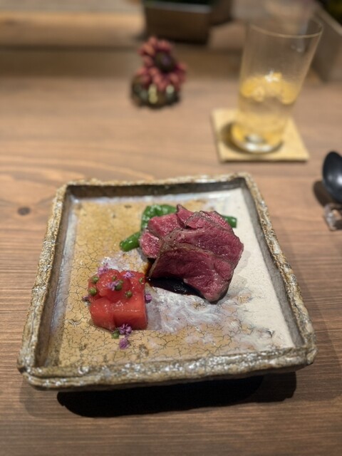 尾崎牛の付け合わせにはなんとスイカ。山椒のピリッとした刺激が良いアクセントになっていて、意外性があります。