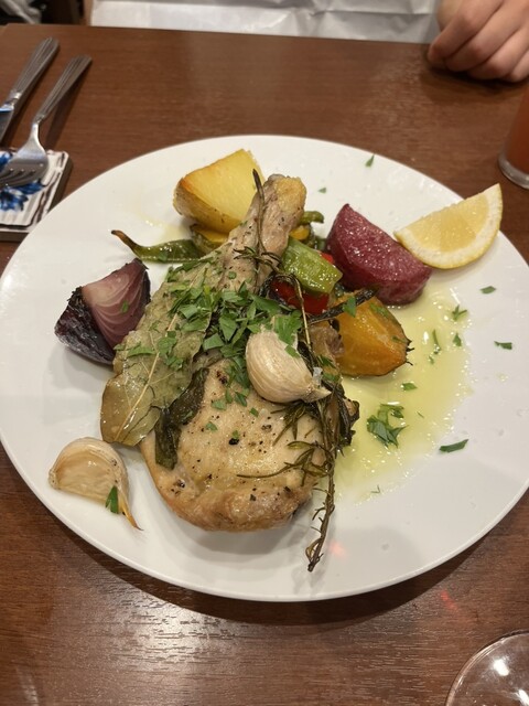ワインは白はモンテオーロ・ヴェルメンティーノ、赤はプティ・ヴィノ・ロッソ。赤はタンニンがしっかりと効いていた。メインの鶏肉もとても美味しかった。