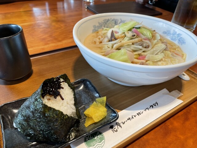 雨風の中、気の置けない仲間達と久しぶりにラウンドしました。ゴルフの楽しみの一つは、やはりランチですね。こちらのレストランならではのメニューを食べたかったですが、あまりに寒かったので海鮮チャンポンとおにぎり1個を頼みました。野菜やエビ、イカなど具沢山。スープも程よく出汁が効いていて塩辛くなく美味しくいただきました。おにぎりも、こんぶがたくさん入っていて美味しかったです。