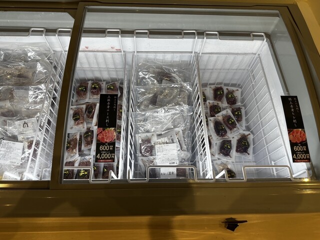 沢山の冷凍ケースが並んでおり、直売所になっている。その奥が飲食スペース。