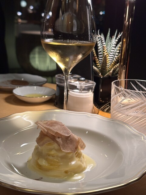エアーで届いたばかりというお目当ての白トリュフを目の前でスライスしてくれて芳醇な香りを堪能。