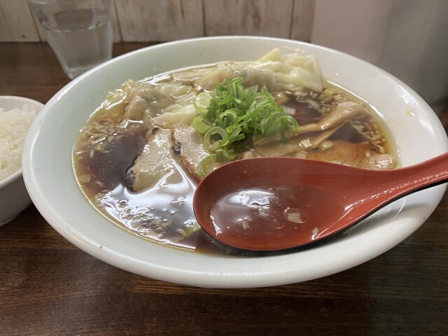 昼食にはチャーシュー肉ワンタンそば(黒)・ライスをいただきました。