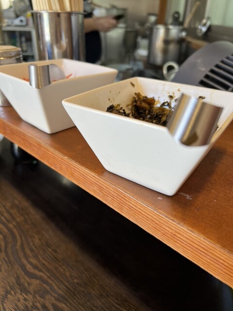 店内カウンターには高菜と紅生姜が取り放題ぽい。