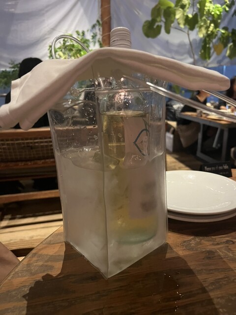 ワインクーラーで使用されていた透明の容器、よく見る硬い筒状のものではなく、軽くて持ち運びに便利そう。キャンプで使いたいんで見つけて買います。