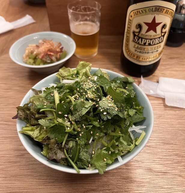 最近の健康意識に沿うように、次の「あて」も野菜の「パクチーボンバー」にしました。しかも大盛りです。