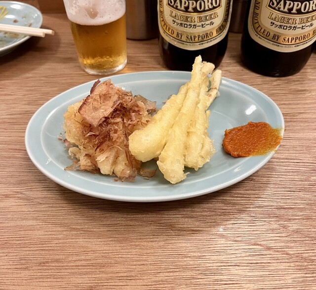 次に「ハムカツ」を挟んだ後、ホワイトボードメニューから「エシャロットと新生姜天」です。