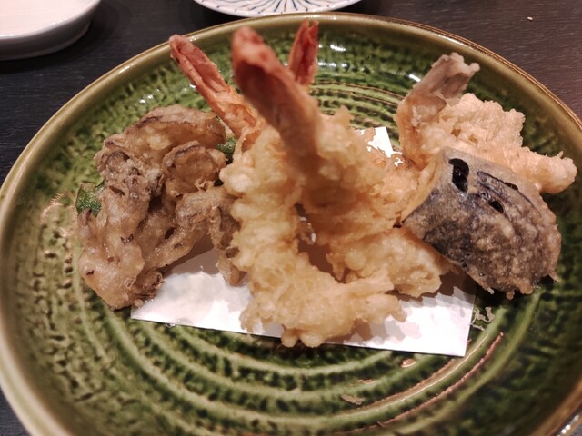 鶏レバーオイル煮・クリームチーズと干しホタルイカの燻製・天ぷらの盛り合わせをオーダー。どれもとてもおいしいです。
