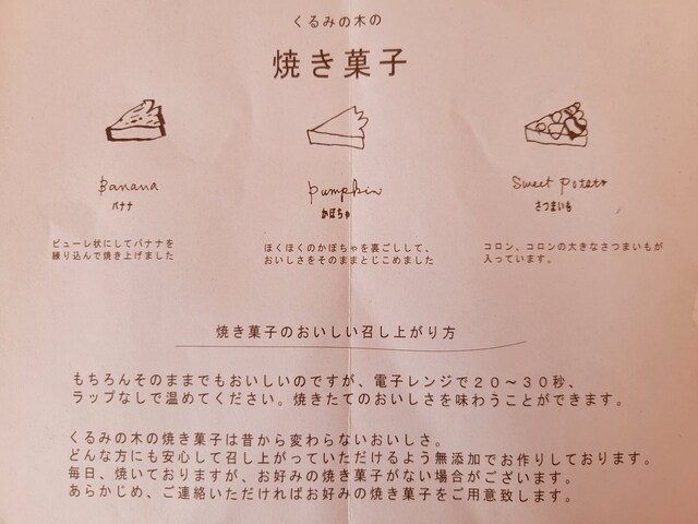 くるみの木の焼き菓子はとっても美味しくて、バナナ、さつまいもは以前食べたけれど、かぼちゃはまだだったので、迷わず購入。