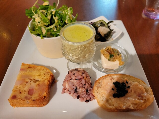 今回の前菜は緑の冷製ポタージュ、ベーコンのケークサレ、キヌアと雑穀サラダ、サーモンとししゃもの卵のカナッペ、豆腐のナツメヤシ味噌のせ、海藻マリネ。