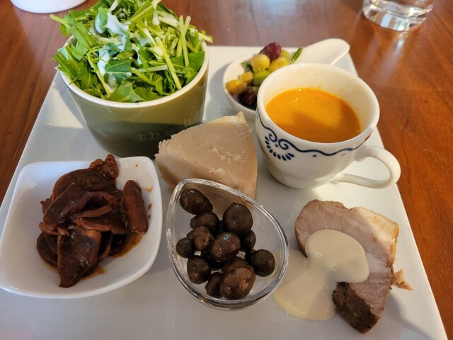 前菜は色々なものが少しずつ盛り合わせ。本日は大根餅、じゃがいもの冷製スープ、オリーブとツナの卵焼き、もやしと昆布の和え物、豚ときのこの和え物、おからサラダ、水菜サラダ。