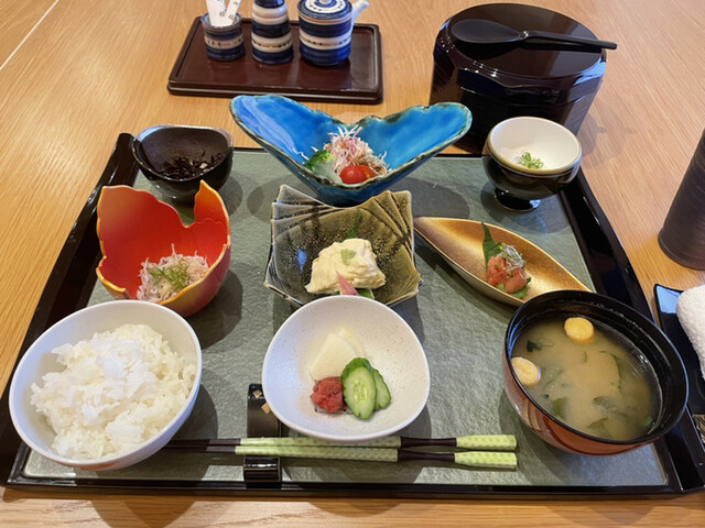 そして翌朝は純和食。おぼんに9種の彩りある器、更に乗り切らない焼き魚等3品。おひつもあり、ご飯をお代わり出来る。最後にポンジュースを頂く。朝からしっかりエネルギーチャージ!