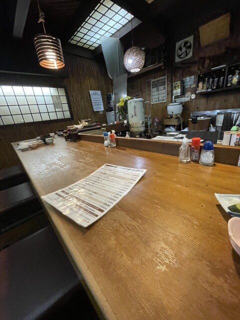 カウンター前は遮るものがなく、フルオープンの厨房。ガス台の上に油の入った大きな鍋、豚汁の入った寸胴鍋、揚げ物の衣が入ったバット等が全て見える。揚げ物一筋の雰囲気ある男性2人が厨房内にいて、ライブで調理を見せてくれる。女性がホールを担当。昭和な感じで、なかなか味わいある店内。