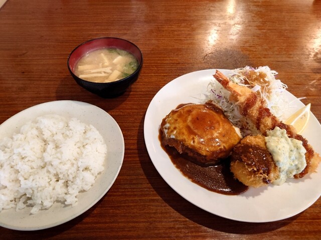 ハンバーグは目玉焼き付きで海老フライも大エビのビッグサイズです。甘めのデミグラスソースがご飯によく合います。カニの風味豊かなクリームコロッケが特に秀逸で素晴らしいの連続でした。