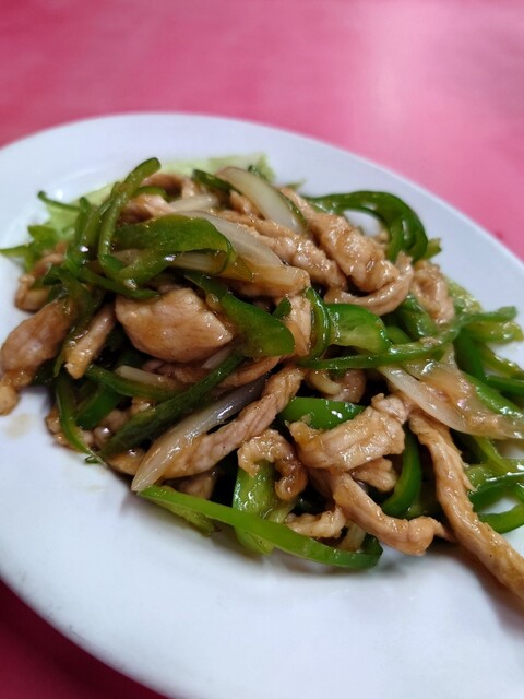 名物の天津飯にピーマンいっぱいで輝いて見えた豚肉ピーマン炒めをオーダーしました。一般的な青椒肉絲ですね。こちらでは豚肉と牛肉の両方があります。15分くらいで提供されました。