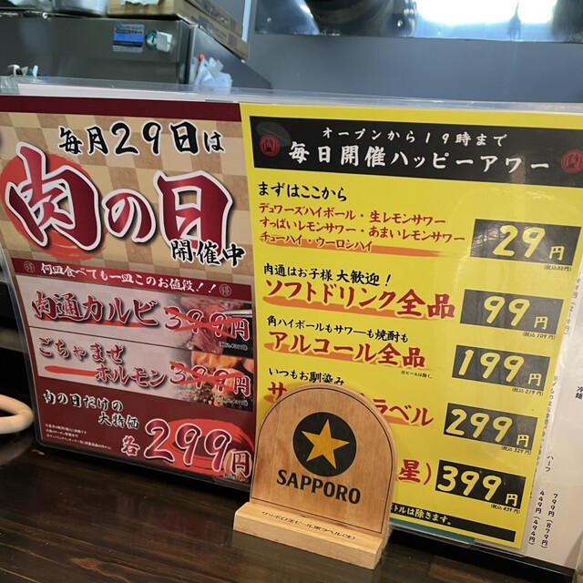 お誕生日お肉プレートプレゼント& キャベツボール2杯、カルビ2皿、ホルモンハーフをツマミに生ビールと翠ジンソーダ2杯、レモンサワー6杯、これで3千円ちょっと。しかも今回は、アプリポイント1000円分使って、さらにお得に٩( 'ω' )و 格安でお腹いっぱいになりました♪いつもありがとうございましす。美味しかったです♪