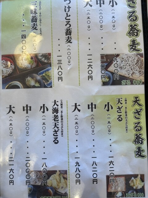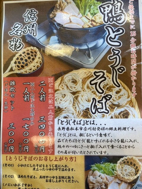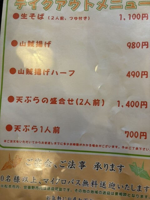 メニューを一通り見て、温かい天ぷら蕎麦と山賊焼ハーフを注文