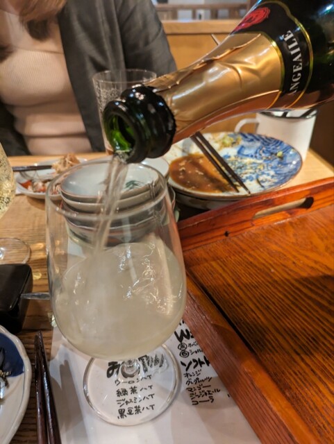 山盛りスパークリングは小さな枡を下に置いて溢れる形でついでくれる。これが飲み放題にはいっているなんて。