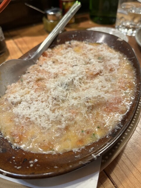 ・トマトチーズリゾット: チーズリゾットの上に大きなおでんトマトが乗って、追いチーズがけがサイコ
