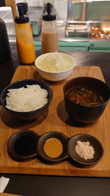 も1つずつオーダーして、これも半分ずつカットしてもらいシェア。それぞれ、定食にできるので、ご飯、キャベツ、味噌汁が付きます。