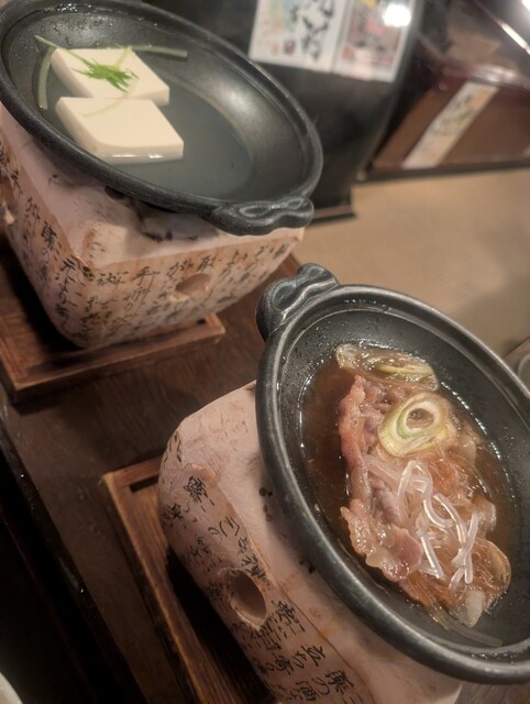 固形燃料で温められた一人用の鍋が2つ(湯豆腐と豚のすき焼き)並び、これだけで大満足の豪華さです。