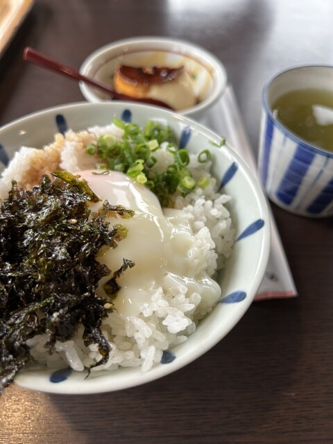 朝ごはんに温卵かけご飯と地獄蒸しプリン