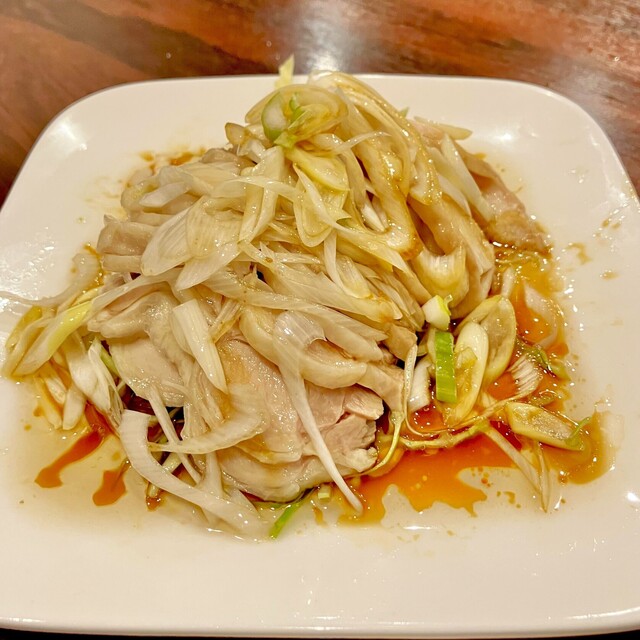 薄切りの蒸し鶏と白葱を醤油だれに絡めて。
