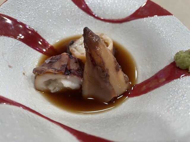 鱈の白子の茶碗蒸し蟹あんかけから始まり、メカジキの行者ニンニク醤油がけ、マナガツオの焼き肴、子持ちヤリイカの煮付け、ヒラメのウニソースがけ全て先付けでお酒が進みます。