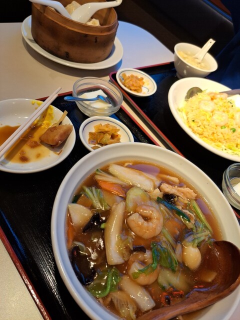 定食と追加で小籠包と春巻きを頂きました。五目湯麺は具だくさんで安定の美味しさ。エビチャーハンはプリプリのエビがたくさん。小籠包は冷めちゃったので汁を吸っちゃったのが残念。春巻きは熱々でパリパリでとても美味しかったです。次回はランチバイキングも行ってみたいです!
