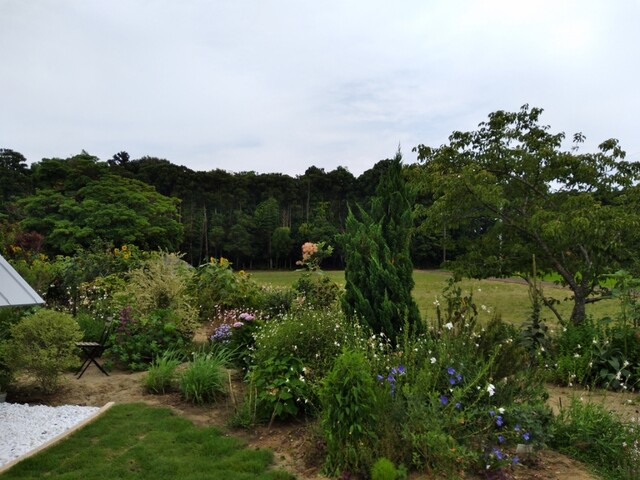 最近増設されたウエイティングルーム、外にはガーデンの草花、その先には田園風景と森林が広がります。