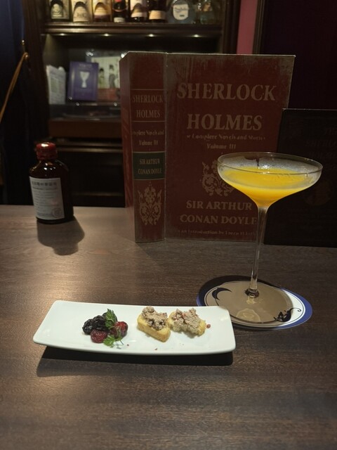シャーロック・ホームズの世界観をテーマにしたユニークなバーで、店内は洋書や重厚なインテリアに囲まれた書斎のような雰囲気。