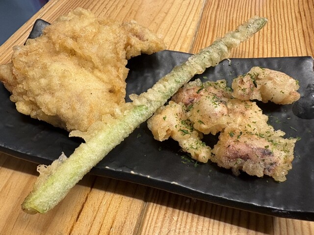 とり天を初めて頼みましたが、大きさにびっくり。コンビニの揚げ物と同じくらいの大きさのとり天をこの値段でいただけちゃうんですか!?前回殿堂入りを果たしたげそはもちろん、気になっていたアスパラも当然の美味しさで大満足でした。