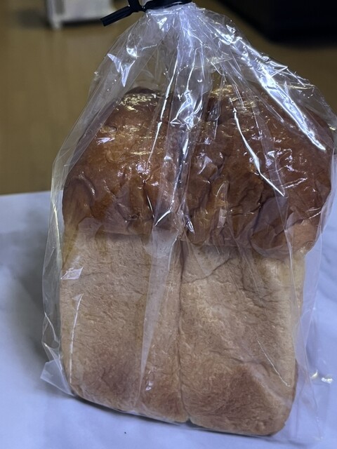 食パン 420円 ツヤツヤで山形が2つになってる!持っただけですごーくもっちり感が伝わります。高加水なのかな?そのままでも、トーストしても美味しい
