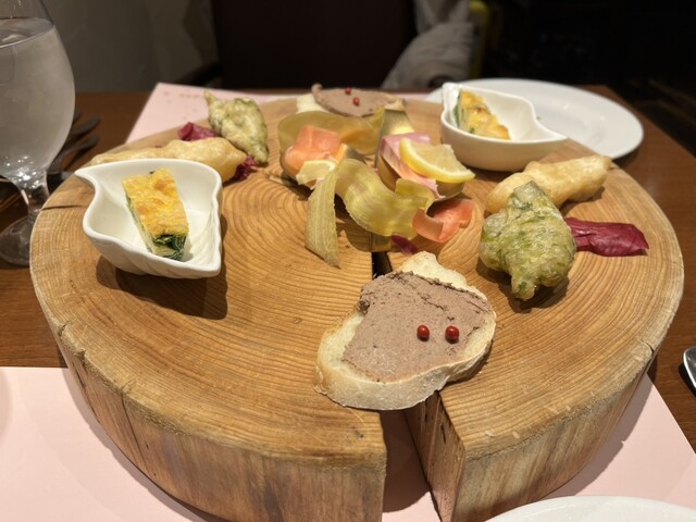 前菜、パスタ、ドルチェ、ドリンクで、パスタによって金額が変わってきます。前菜は切り株のようなお皿にのっててインパクトあり!盛り付けも綺麗でどれも美味しい。飾り付けの野菜も何もつけずに食べて美味しいです。パスタはシェアしましたが、1皿ずつシェアしての提供をしてくださって、量もしっかりあってびっくり。桜エビのペペロンチーノにしらすのかき揚げというメニューでしたが、かき揚げ!?はふんわり卵の生地のフリッターのようでした。地魚のボロネーゼはマグロと鰤、どちらのパスタもとても美味しい!!