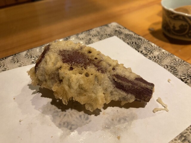 黒舞茸は天つゆにドボンとつけて食べてとのことで、カリサクの衣を塩でいただくのも天ぷらの楽しみである一方、つゆにひたひたにする食べ方が美味しいのも事実で、それを積極的にすすめてくれるご主人に感動しました。