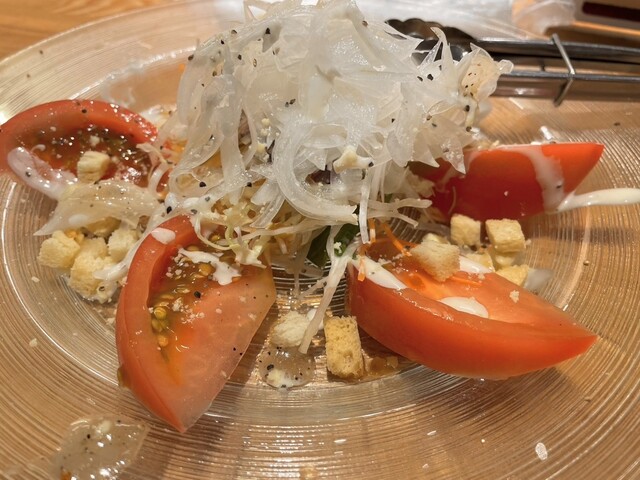 上馬刺し、本日の3種盛り、ステーキチャーハン、いぶりがっこクリームチーズ、トマトとオニオンのサラダ(写真は少し取り分けた後です^^;もっと美しく盛り付けてありました)