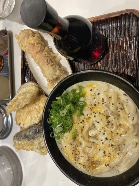 うどんは他の方のレビュー通り美味しいですね。ただ、私的には天ぷらが非常に美味しい。こんなにうどんに合う用に丁寧に作られた天ぷら初めて食べました。めちゃくちゃ美味い。かしわ天にはモモ肉使っていて、食べ応えバッチリ。ちくわはガーリック味だったのかな?ぶっといちくわで、美味かったー。
