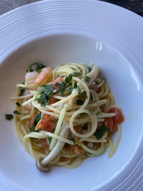 カプレーゼ、サラダ、パンパスタ、ニョッキ、メインのポーク、ピスタチオのアイスクリームとパンナコッタ、コーヒーどれも美味しかったです。