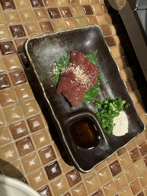 別でレバー刺身を頼み、食べましたが鶏のレバー刺身とはまた違った食感!味はもちろん胡麻油と塩メインですが少し弾力感があり美味いです!