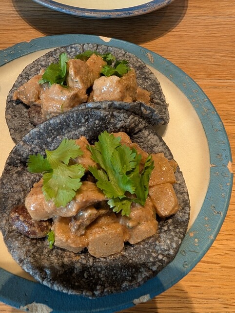 妻のタコスも一口ずつ頂ききのこ、鶏肉どちらも素材の良さが引き出され鼻を近付けただけで食材の香りが立ちとても良い。今度普通に食べたい。