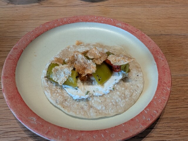 福耳唐辛子と山羊のチーズは辛めのテイスト。山羊のチーズは香り良くとても楽しませて頂きました。これはソース追加しないで食べ切ってしまう。ちなみに妻はオススメのセットを頼んでいて辛いからと一口食べたのをパスされる。ちょっとサルサソースを追加。味変しても美味しい…