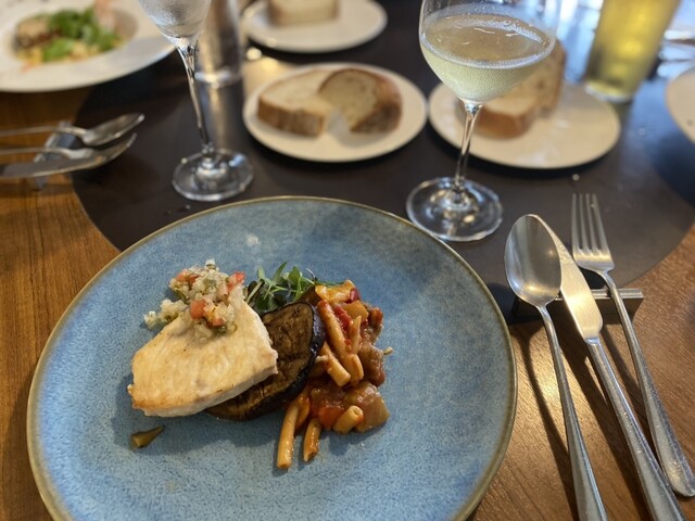 2,700円のコースで、前菜はチキンのサラダ、メインはカサゴと野菜のナージュを頼みました!